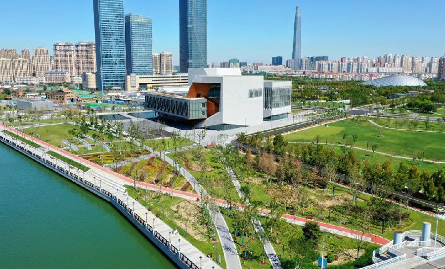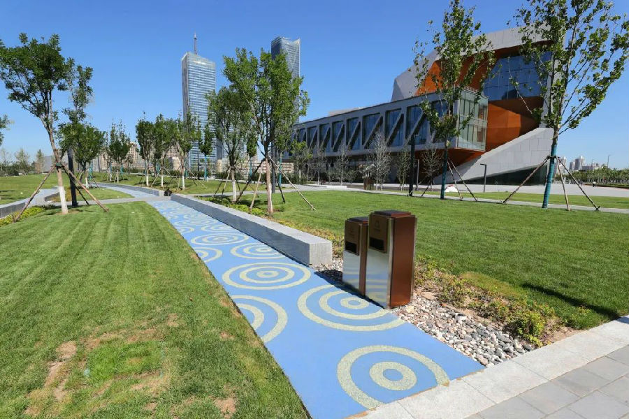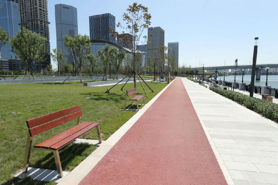 茱莉亞濱河公園作為天津茱莉亞學院的重要配套工程,為學院提供了良好的生態(tài)配套環(huán)境的同時,也為市民提供了散步、休憩的公共場所。綠廊系統(tǒng)貫穿整個公園,還配備了自行車道、散步道、木板路,以及充足的座位。目前,茱莉亞濱河公園已成為新區(qū)一道美麗的濱河風景線。