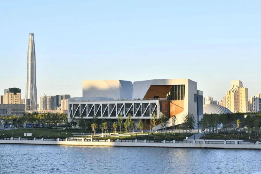 這座距離海河不到200米的建筑,從外觀看呈不規(guī)則多面體外形,各單體間由五條大跨度折線形連廊聯(lián)結(jié)而成,底部為“茱莉亞幻想”公眾展覽空間。全天候?qū)ν忾_(kāi)放,與海河及周邊綠化公園融為一體。
