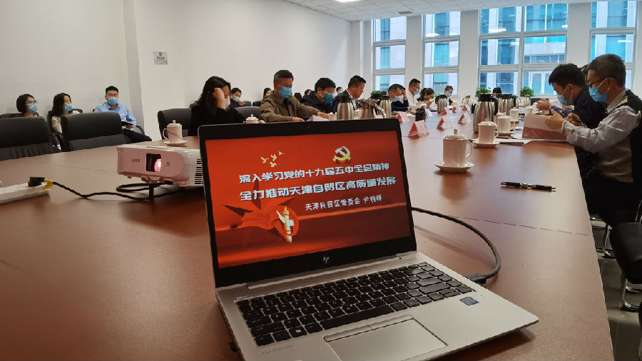 11月30日下午,天津自貿區管委會專職副主任、濱海新區副區長、創新發展局局長尹曉峰同志在濱海新區文化商務中心召開了學習貫徹黨的十九屆五中全會精神宣講會。曉峰同志以“深入學習黨的十九屆五中全會精神,全力推動天津自貿區高質量發展”為題進行了宣講。天津自貿區管委會辦公室、自貿區創新發展局全體同志,天港港東疆片區、天津機場片區、中心商務片區自貿工作局相關負責同志參加了會議。