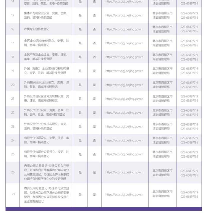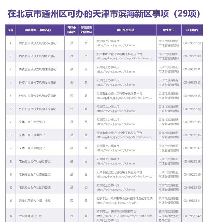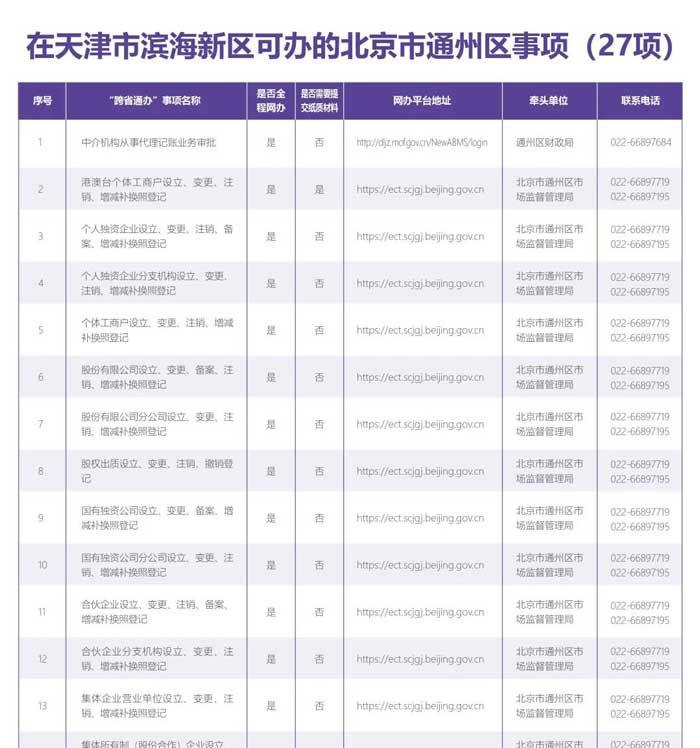 在濱海新區可辦北京市通州區27個事項,包括中介機構從事代理記賬業務審批,以及個人獨資企業設立、變更、注銷、備案、增減補換照登記等26項商事登記事項:
