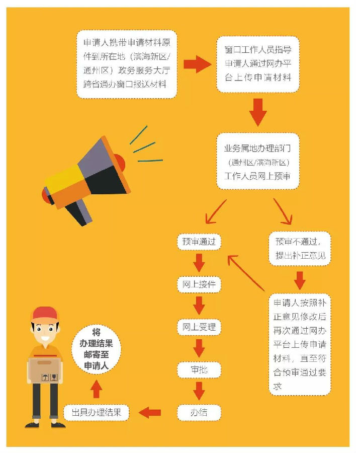 凡在北京市通州區、天津市濱海新區(含各開發區)申請開辦企業的投資者,或注冊地址位于北京市通州區、天津市濱海新區(含各開發區)的企業,均可在兩地任意一個“跨省通辦”窗口提交申請辦理“跨省通辦”事項,由“跨省通辦”窗口工作人員負責業務指導、咨詢和收件,業務屬地部門負責受理、辦理審批業務并發放許可證照。