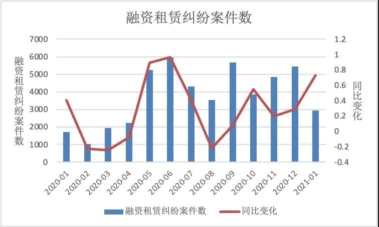 1月份,與融資租賃企業相關的開庭案件數約2949件,2020年同期開庭案件數1704件,2021年1月同比上升約73.06%,其中本月開庭數前十位的融資租賃企業下表所示。
