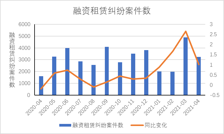 與融資租賃全行業(yè)樣本企業(yè)相關(guān)的4月份開庭案件數(shù)約3231件,2020年同期開庭案件數(shù)1600件,2021年4月同比上升約101.94%,與2、3月份的同比增幅有明顯減少,其中本月開庭數(shù)前十的融資租賃全行業(yè)樣本企業(yè)如下表所示: