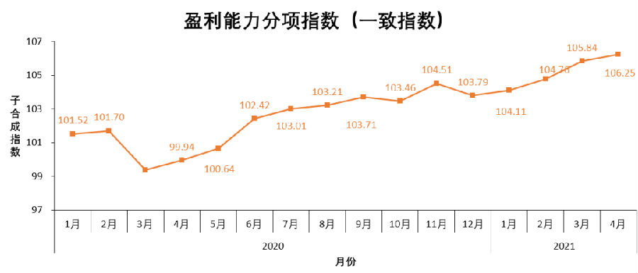 2021年4月份的盈利能力一致指數(shù)持續(xù)上升,由2021年3月份的105.84點上升到2021年4月份的106.25點,較2020年4月份的99.94點增加將近6.31點,同比增幅較大,為2019年1月份以來的最高點;盈利能力先行指數(shù)自2020年12月以來連續(xù)三個月增加,2021年2月有小幅下降,2021年4月份的盈利能力先行指數(shù)為104.82點,較2021年3月份的104.50點有微幅上升。
