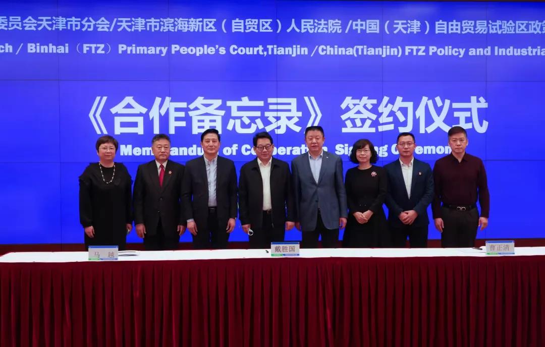 天津市貿促會黨組書記、會長姜德志,濱海新區區委常委、副區長、自貿區管委會專職副主任、自貿區創新發展局局長尹曉峰,天津市貿促會黨組成員、二級巡視員戴勝國,濱海新區(自貿區)法院黨組成員、副院長馬越,自貿區創新發展局副局長曹正清出席簽約儀式。