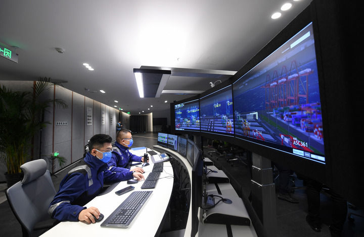 工作人員在天津港北疆港區C段智能化集裝箱碼頭智控中心內監控碼頭作業狀態(2021年10月17日攝)。新華社記者 趙子碩 攝