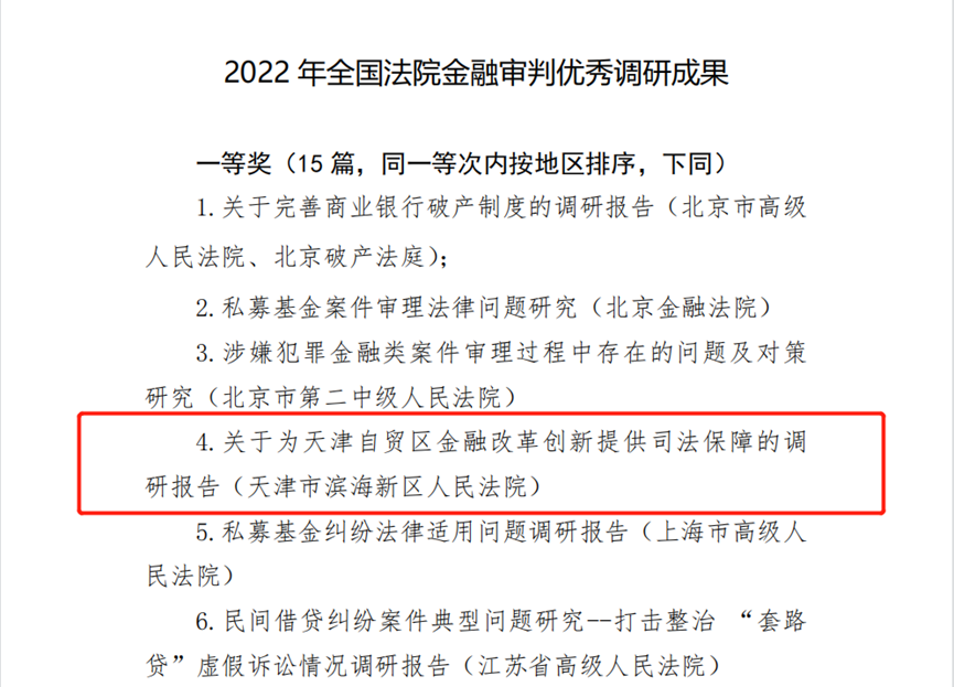 近日,最高人民法院發布了《關于2022年全國法院金融審判優秀調研成果評選情況的通報》。天津濱海新區法院(天津自貿區法院)由耿亮、陶俊撰寫的《關于為天津自貿區金融改革創新提供司法保障的調研報告》,喜獲一等獎。