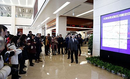 期間,記者團一行走訪了東疆行政服務中心、國家租賃和新金融展示中心、東疆海鐵換裝中心等地,與相關負責人、企業代表進行了面對面交流。