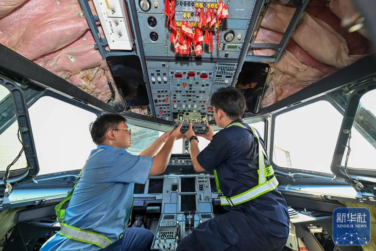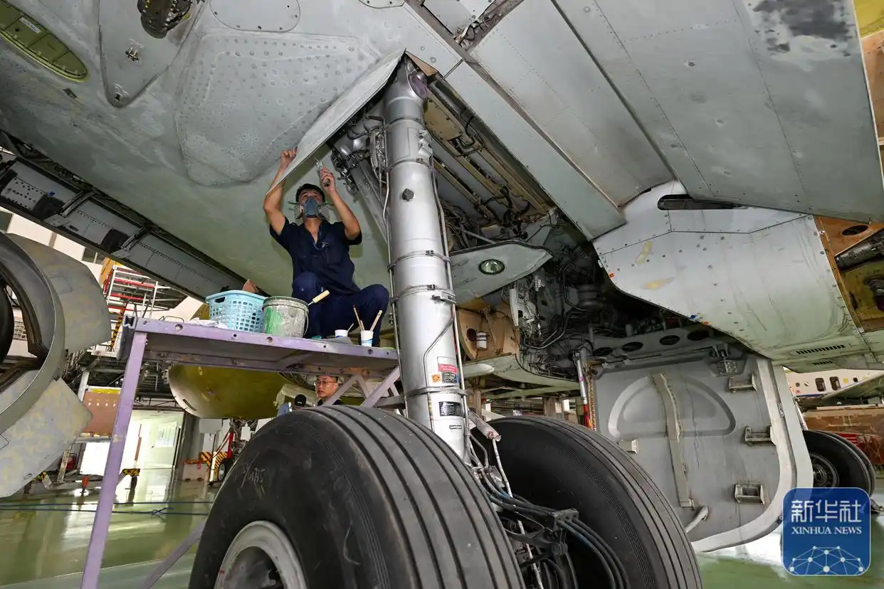 ↑ 6月18日,在天津自由貿(mào)易試驗區(qū)天津機場片區(qū)內(nèi)的天津海特飛機工程有限公司,工作人員在機庫內(nèi)對飛機進行保稅維修。