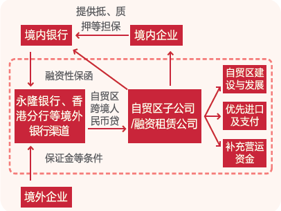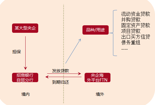 基于客戶實(shí)需背景,以境內(nèi)企業(yè)抵、質(zhì)押物作為擔(dān)保或占用境內(nèi)企業(yè)在我行授信額度開立融資性保函或者他行開立融資性保函,保函受益人為招行離岸、永隆銀行、香港分行等招行行境外聯(lián)動(dòng)平臺(tái),由招行境外聯(lián)動(dòng)平臺(tái)為自貿(mào)區(qū)注冊(cè)企業(yè)發(fā)放本外幣外債貸款的融資模式。