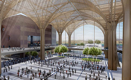 走近文化中心,最顯眼的建筑結構就是文化長廊的28根傘狀支柱,古銅色的傘狀支柱高35.7米,就像骨架一樣將五大場館進行連接,撐起的玻璃天花板,在白天可以自然采光,也使得整個場館格外通透。文化長廊的核心區域也是整個建筑的中心區域被稱作“金色大廳”,復古的支柱色彩搭配著周邊場館外圍幕墻的顏色韻味十足。未來建成后,這里將打造成特色文創街區,并為五大場館提供餐飲配套服務。