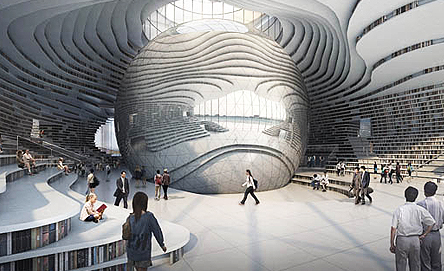 圖書館是文化中心的一大亮點,尤其是中心區域的“濱海之眼”。圖書館采用的是玻璃幕墻設計,從場館外可以直接觀看到圖書館的內部構造。從外向場館內部望去,坡狀的階梯書上走廊成弧形向兩端升起,中心的共享空間成球狀,無論是從文化中心外側還是從文化長廊向內望去,整個造型就像人的眼球一樣。球狀的共享空間未來將成為新書發布會和各種路演的場所。