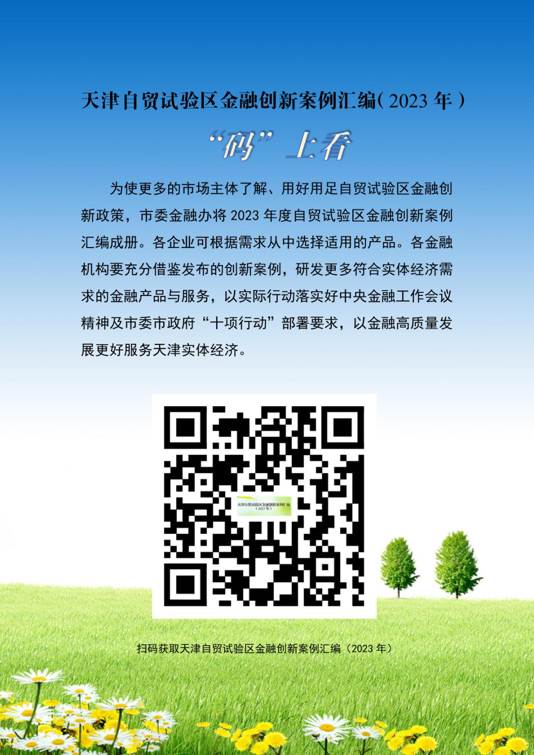 天津自貿試驗區掛牌成立9周年之際,市委金融辦推出年度26個金融創新案例,制作了2023年度自貿試驗區金融創新案例匯編,可掃碼獲取,方便各類市場主體充分了解,并用好用足自貿試驗區金融創新政策。